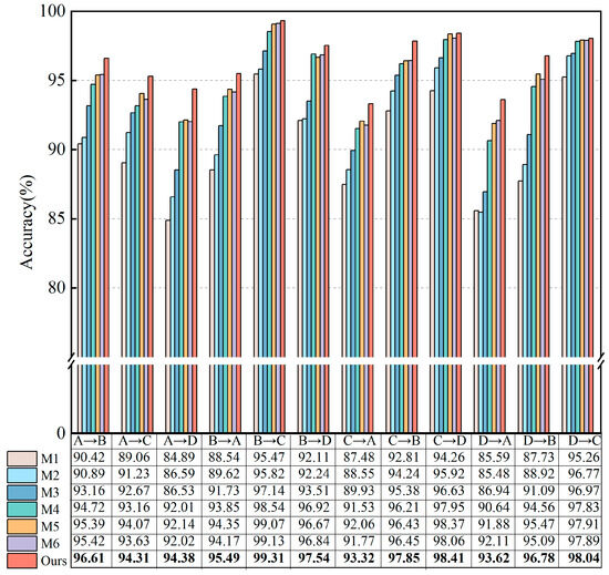In the A → D transfer learning task with an IBR of 0.1, the average diagnostic accuracies of models M1, M2, M3, M4, M5, and M6 were 79.89%, 79.77%, 84.53%, 90.16%, 90.28%, and 90.24%, respectively. In comparison, the average diagnostic accuracy of the NG-UDAN method improved by 13.21%, 13.33%, 8.57%, 2.94%, 2.82%, and 2.78%, respectively, demonstrating a significant enhancement. This improvement can be attributed to NG-UDAN’s adoption of an efficient feature extraction network that generates generalized representations by exchanging statistical information and confusing domain discrimination. Additionally, it mitigates the negative impact of imbalance on domain adaptation through a subdomain alignment strategy and class-level reweighting. The synergistic effect of these various factors contributes to the increased accuracy of the proposed method in fault diagnosis.