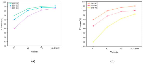 Table 7 presents the settings for the four scenarios of the ablation studies, while Figure 13 illustrates the accuracy and F1-score of the NG-UDAN model across various levels of class imbalance. The results indicate that all three components are essential for the performance of the NG-UDAN model.