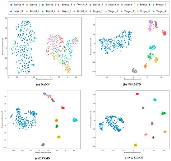 In this part, we selected the DANN, NSAMCN, DVSMN, and our proposed NG-UDAN for further visualization analysis of the learned representations. We employed the t-SNE technique to project the outputs from the feature extractor into a two-dimensional space, facilitating a more intuitive visualization of the domain alignment capabilities of the four methods. Figure 14 presents the t-SNE visualization results for the various methods in transfer tasks B → C with an IBR of 0.1. Different shapes in the figure represent distinct data domains, while colors denote various fault types.