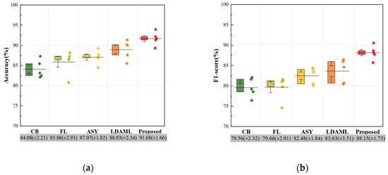 It is evident that the GWFL method significantly outperformed other imbalanced transfer learning methods when addressing mixed-source domains. The average diagnostic accuracies for the CB, FL, ASY, and LDAML methods were 84.08%, 85.86%, 87.07%, and 88.93%, respectively. In comparison, the GWFL method enhanced average diagnostic accuracy by 7.60%, 5.82%, 4.61%, and 2.75%, while also exhibiting lower standard deviations than the other four methods. Under the highly imbalanced condition with an IBR of 0.1, the proposed method exhibited the smallest gap between accuracy and F1-score, further demonstrating the superiority of the sample reweighting strategy based on gradient properties.