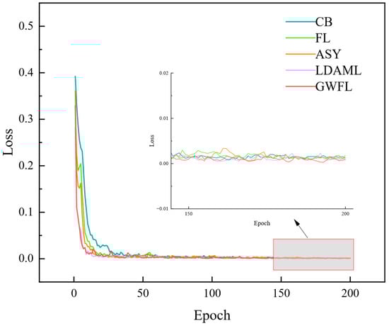 We have further investigated the stability of the GWFL method, comparing the loss curves of the CB, FL, ASY, LDAML, and the proposed method throughout the training process, as illustrated in Figure 16. The results indicated that the GWFL method exhibited superior performance in terms of loss profile, converging faster and more smoothly as the number of epochs grows. In contrast, the CB method displayed the slowest convergence, with the loss profile gradually stabilizing after approximately 50 training epochs. Furthermore, the FL and ASY methods exhibited bigger variations in their loss curves and higher loss values, indicating that merely focusing on challenging samples is inadequate for addressing significant class imbalance. When compared to the ASY model, LDAML, which takes into account marginal feature distributions, achieved lower loss values. Notably, the proposed GWFL method converged rapidly within 20 epochs, and the fluctuations in loss values were less pronounced than those observed in LDAML. Additionally, the continuous updating of category weights at each learning batch mitigated the risk of overfitting for the majority of categories, facilitating a more gradual approach to the optimal solution.