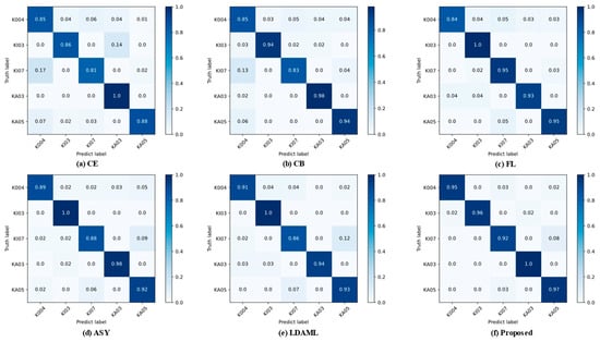 The confusion matrices of CE, CB, FL, ASY, LDAML, and the proposed method were compared in the B-C-D → A transfer task at IBR = 0.1 to give a clearer view of each model’s diagnostic outcomes for each class. The CE approach is one of them that works well with balanced datasets and can be used as a standard for comparison. The column labels in these visualizations show the true names for fault classes, whereas the row labels provide the diagnostic results. As shown in Figure 17, when attempting to differentiate between normal samples, KI07, and KA05, the fault classification accuracy of CE was noticeably lower. This implied that minority classes may be incorrectly classified as majority classes by techniques that fail to consider imbalanced conditions. CB had somewhat reduced the overfitting phenomenon seen in KI07 and KA05 by considering the effective number of samples for each class. In comparison, FL’s diagnostic accuracies for these two fault types were 95% and 95%, respectively, representing a significant improvement. Furthermore, ASY and LDAML, which have outstanding capabilities for clarifying decision boundaries between classes, tended to confuse difficult-to-classify minority samples in the presence of extremely imbalanced data. However, the proposed approach somewhat resolved the problem of misclassifying difficult samples by dynamically assigning different weights. The results demonstrated that GWFL efficiently tackles more complex fault diagnosis tasks by dynamically allocating higher weights to tail samples based on the gradient ratio of positive and negative samples. This ensures that classes with fewer samples have their significance increased in the loss calculation, thereby making the model more sensitive to fine-grained details within those classes. Furthermore, the method enhances the gradient update flow for challenging samples, enabling the network to refine its decision boundaries more accurately when distinguishing between categories with similar characteristics. Consequently, the method exhibited robust classification capabilities for various rolling bearing fault types in the experiments.