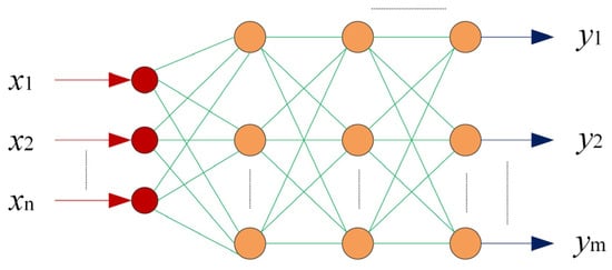 The RBF neural network and MNN began to emerge in the field of automatic control and pattern recognition. Taking the feedforward neural network as an example, their structures are depicted in Figure 2 and Figure 3, both of which are arranged hierarchically and in parallel. Aside from that, the input is transmitted from the input layer through the hidden layer to the output layer without feedback, which symbolizes the characteristic of the feedforward network.