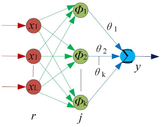 In general, the RBF neural network chooses the Gaussian function as the neuron excitation function of its hidden layer. The input parameter is , and the input parameter dimension is the L dimension. The number of hidden layer neurons is , and the output of the hidden layer is . The output of the neural network is as follows: