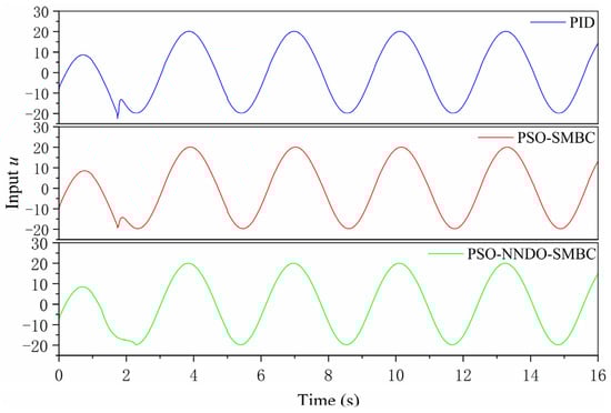 As the derivation indicates, the displacement of the hydraulic cylinders is influenced by the parameters of the motion model. In line with Formula (16) alone, it proves that input controls the changes of , controls the changes of , and controls the changes of . In such a case, Formula (16) can be regarded as a series integral system composed of three integrations from to . Hence, this paper starts with Formula (16) and combines the Lyapunov stability theory, and the PSO-NNDO sliding mode backstepping controller is studied.