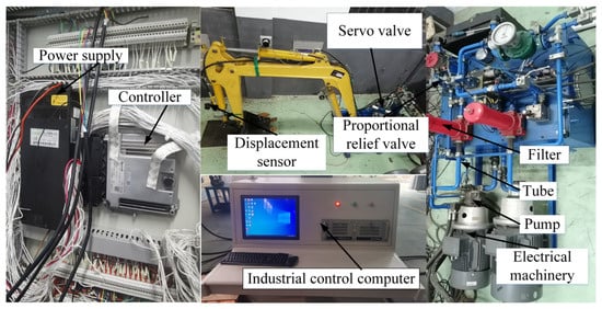 As one of the most common pieces of construction machinery in current engineering operations, excavators cover multiple industries, such as transportation, water conservancy, electric power construction sites, mining, and national defense [,]. In recent years, control systems and hydraulic components have been optimized continuously. Moreover, robot trajectory planning and automatic control technology are becoming increasingly cutting-edge. These improvements facilitate the intelligent and automatic operation of excavators. Nevertheless, in the motion process of the excavator electromechanical hydraulic servo system, numerous factors, such as highly nonlinear, parameter uncertainty and large external disturbance, pose great challenges to position tracking accuracy control []. Consequently, in the past decades, investigators have been exploring state-of-the-art control methods to elevate the control performance of the excavator hydraulic servo system.