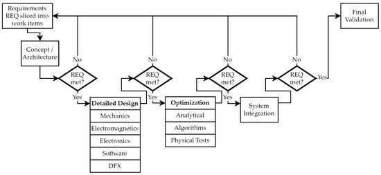 The development of complex mechatronic EMLAs requires a systematically structured and agile design framework such as the commonly used V-Model [41]. The framework utilizes a multidisciplinary collaboration of different engineering fields (Figure 2). Elicitation of requirements is followed by the design phase, system integration, verification, and final validation.