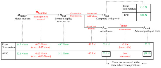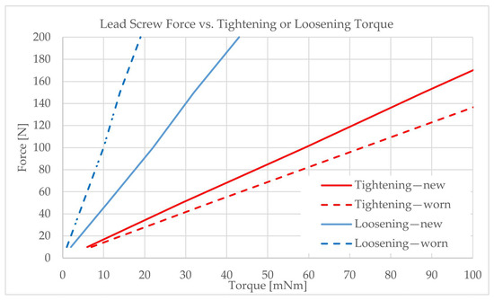 Realistic lead screw efficiency η l depends on the lead screw’s angle λ = arctan p π · d r , friction angle ϕ =   t a n 1 μ , and coefficient of friction between the lead screw and the nut μ .