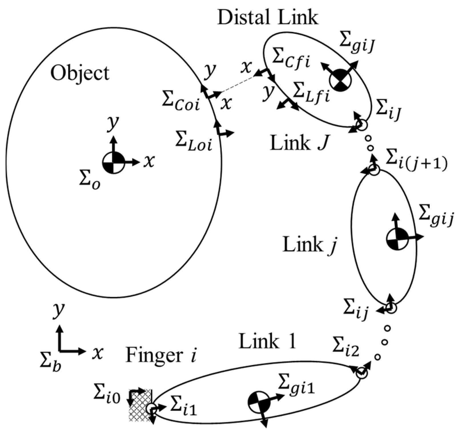 - Yamada, T.; Johansson, R.; Robertsson, A.; Yamamoto, H. Static Stability Analysis of a Planar Object Grasped by Multifingers with Three Joints. Robotics 2015, 4, 464–491. [Google Scholar] [CrossRef]