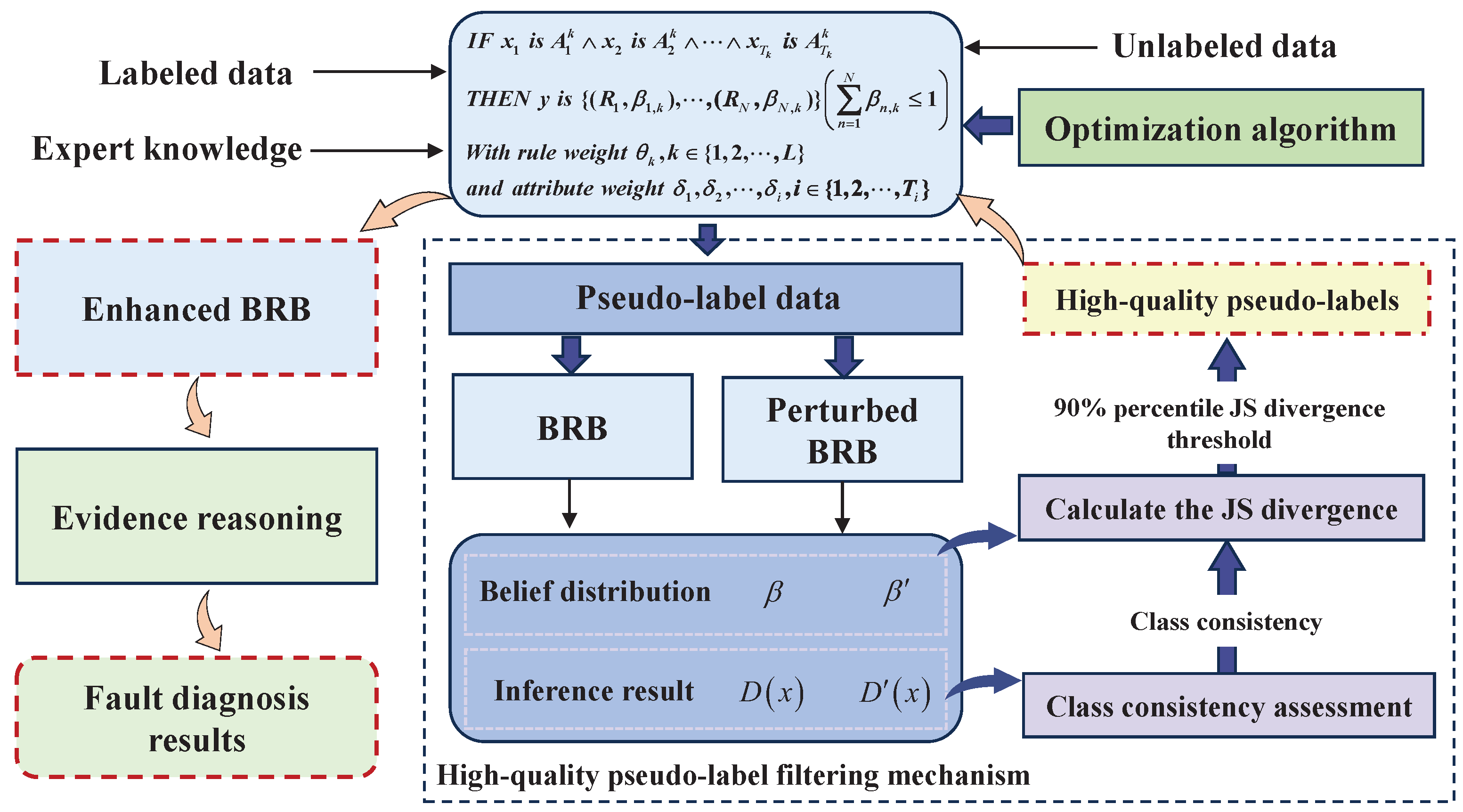 These filtered high-quality pseudo-labels are used, along with an optimization algorithm, to update the rule weights, attribute weights, and belief degrees of the BRB. The enhanced BRB model is then used for ER and final fault diagnosis. This iterative process allows the PS-BRB to leverage unlabeled data effectively, improving both accuracy and generalizability capability in complex system diagnostics.