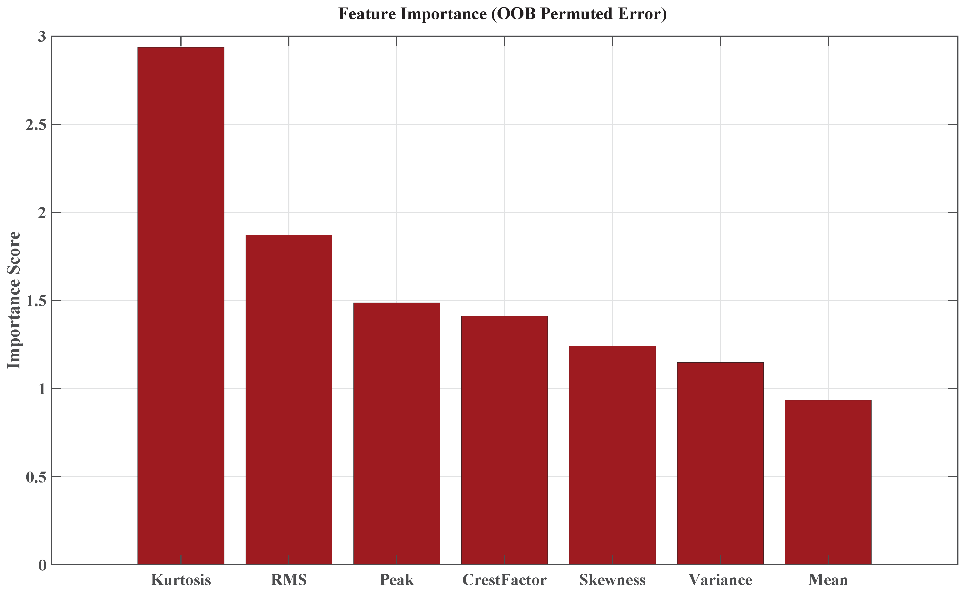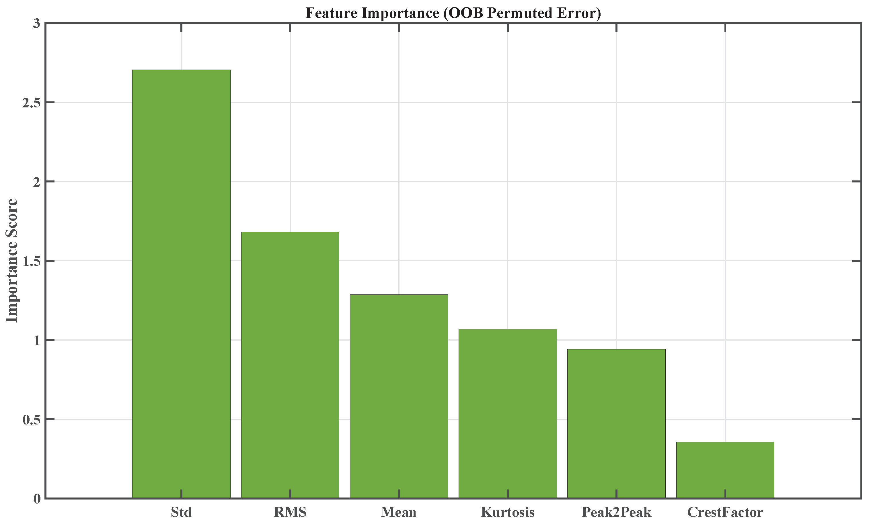 In this work, data under the operating condition of a 65 Hz rotational speed are selected for analysis. The raw data file contains five channels: time step (Time), rotational speed (Speed), and vibration acceleration in the X, Y, and Z directions. To ensure the consistency of the input data and the controllability of the experiment, the vibration signal in the X-axis direction is selected for analysis. A sliding window approach is applied for time-domain feature extraction with a window length of 2048 and a step size of 256. Subsequently, based on the results of feature importance ranking, the two most representative time-domain features, namely Kurtosis and RMS, are subsequently selected as inputs to the model, as shown in