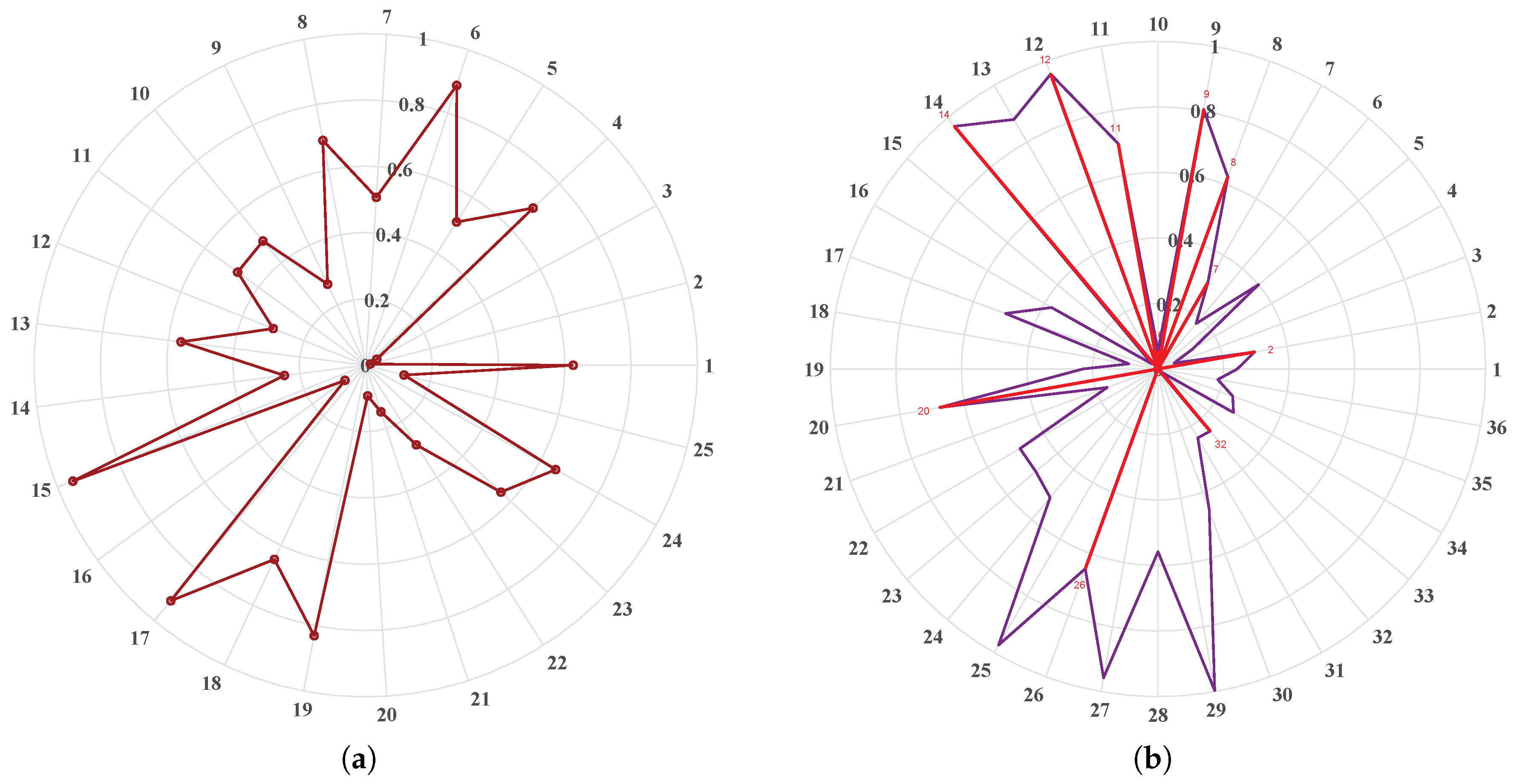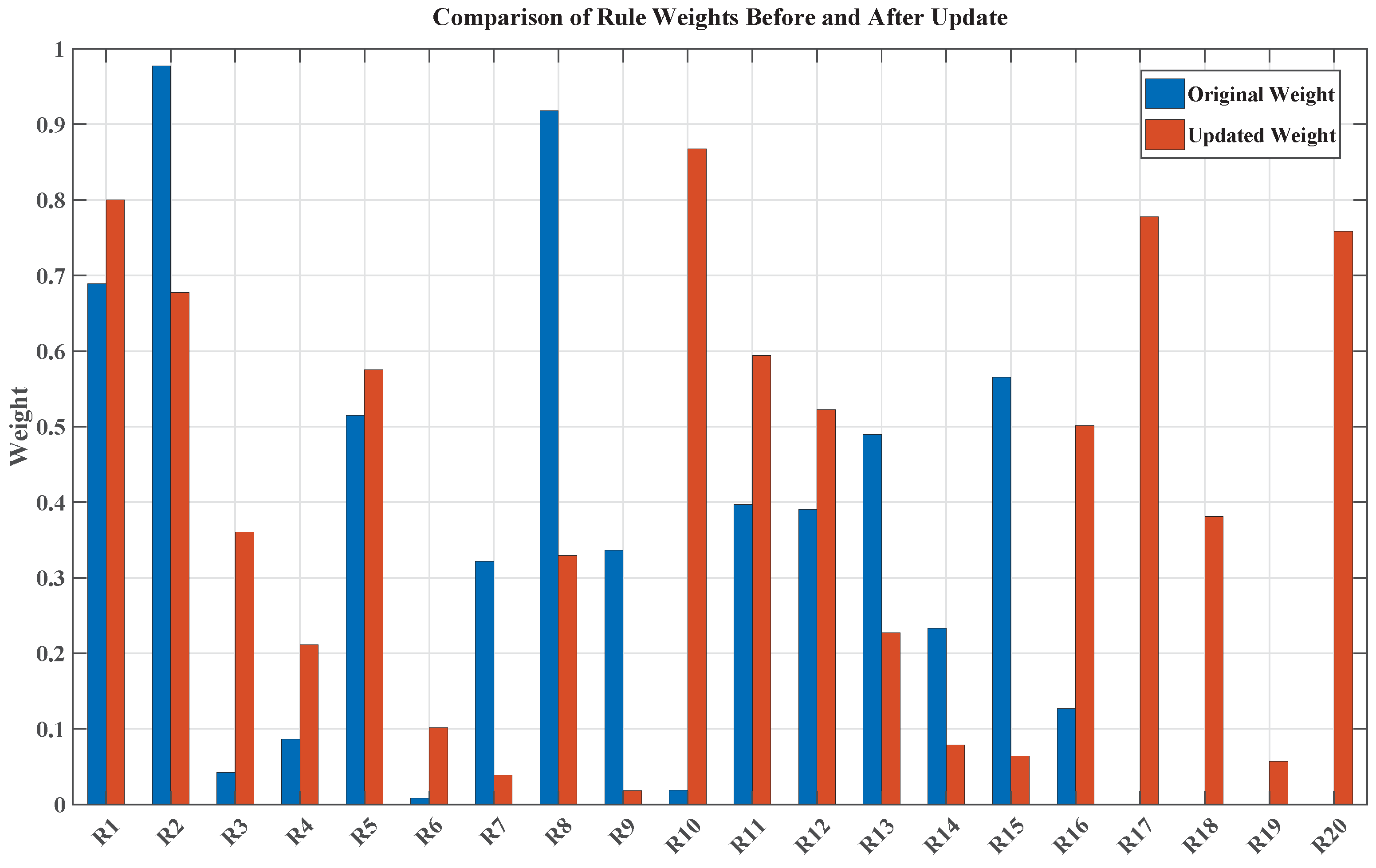 Figure 9a,b present the distributions of rule weights at two stages: before and after the update. The left plot illustrates the original rule weight distribution of the 25 rules prior to enhancement, whereas the right plot shows the updated rule weight distribution across all 36 rules with newly added rules (R2, R7–R12, R14, R20, R26, and R32) highlighted in red.
