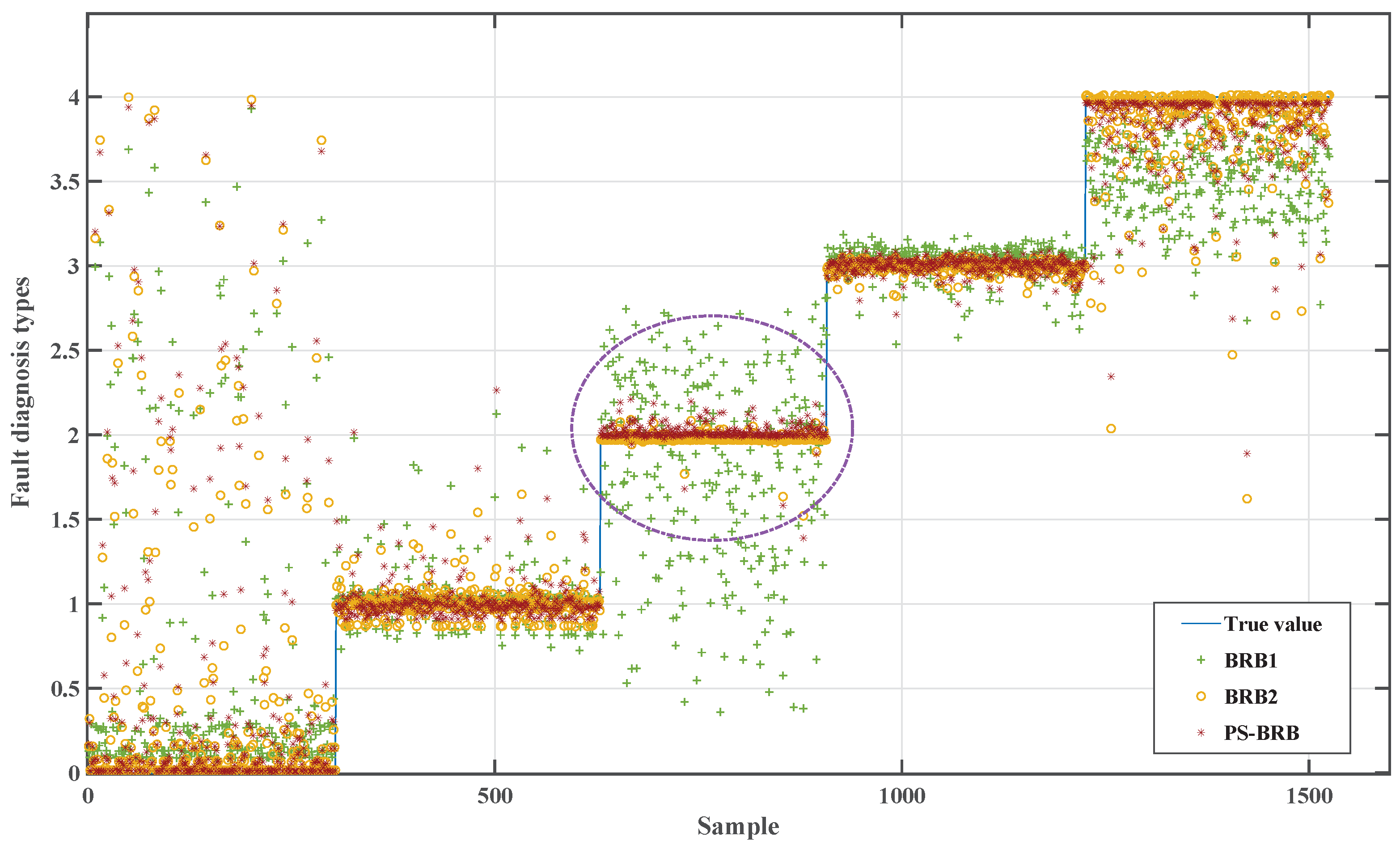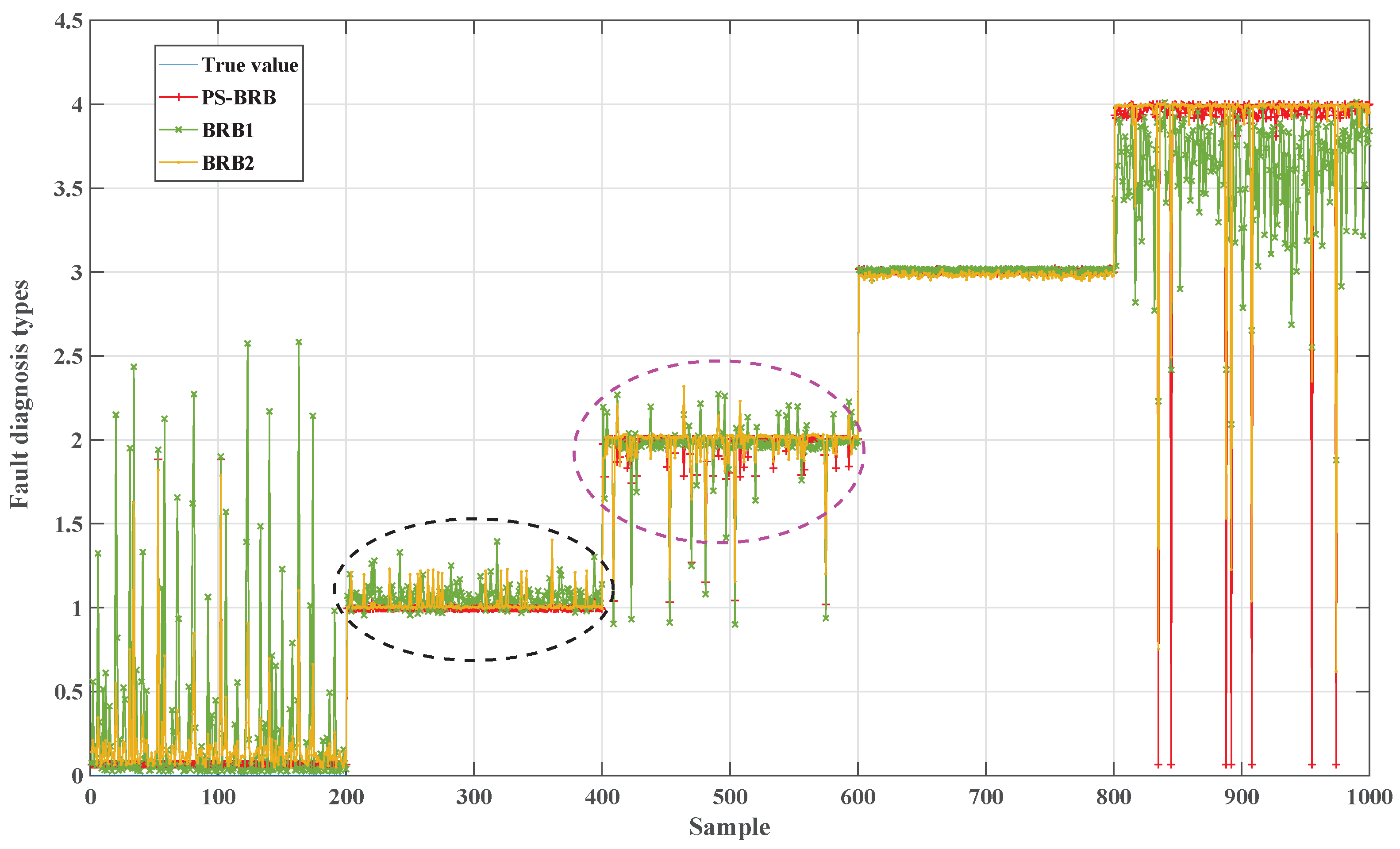Figure 10 illustrates that the prediction trajectory of PS-BRB on the test set closely aligns with the true fault types with the predicted values in stable intervals nearly coinciding. The overshoot and oscillation amplitudes near the transition points are significantly lower than those of BRB1 and approach those of BRB2, which is trained with fully labeled data. Notably, in the segment marked by the purple dashed circle, BRB1 exhibits numerous high-amplitude spikes and drops, indicating unstable rule matching under limited labeled conditions. Although BRB2 generally maintains stability, occasional large deviations are observed. In contrast, PS-BRB displays the lowest fluctuation amplitude and frequency with the fastest convergence speed after transitions, reflecting superior robustness to distribution drift.
