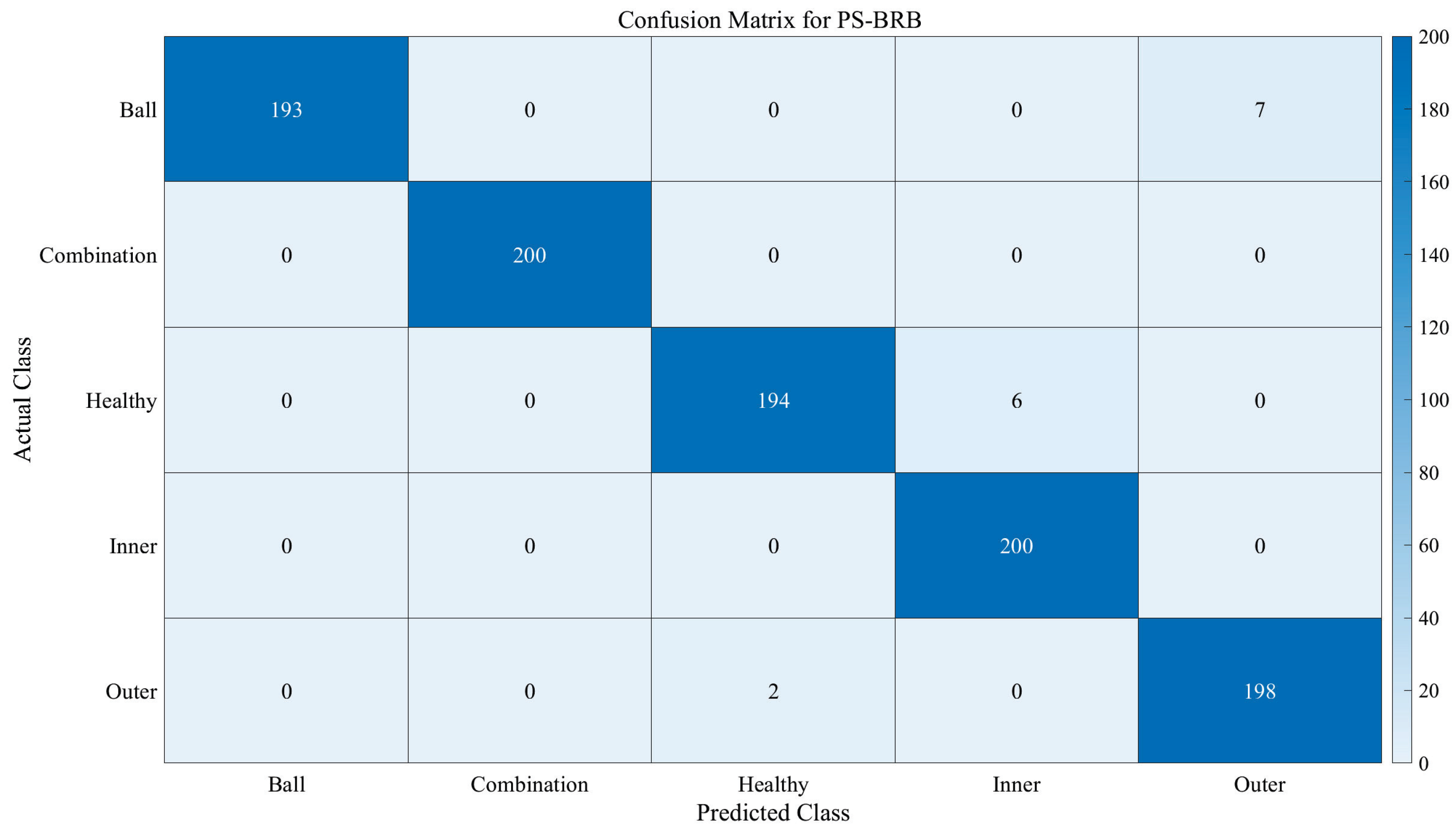The experiment includes five typical operating conditions, including ball fault (Ball), inner race fault (Inner), outer race fault (Outer), compound fault (Comb, referring to the simultaneous presence of multiple fault types), and healthy condition (Health). Vibration data under each condition are used to construct training and testing samples. Fault diagnosis modeling is then performed to systematically evaluate the performance and adaptability of the proposed PS-BRB method in bearing fault diagnosis tasks.