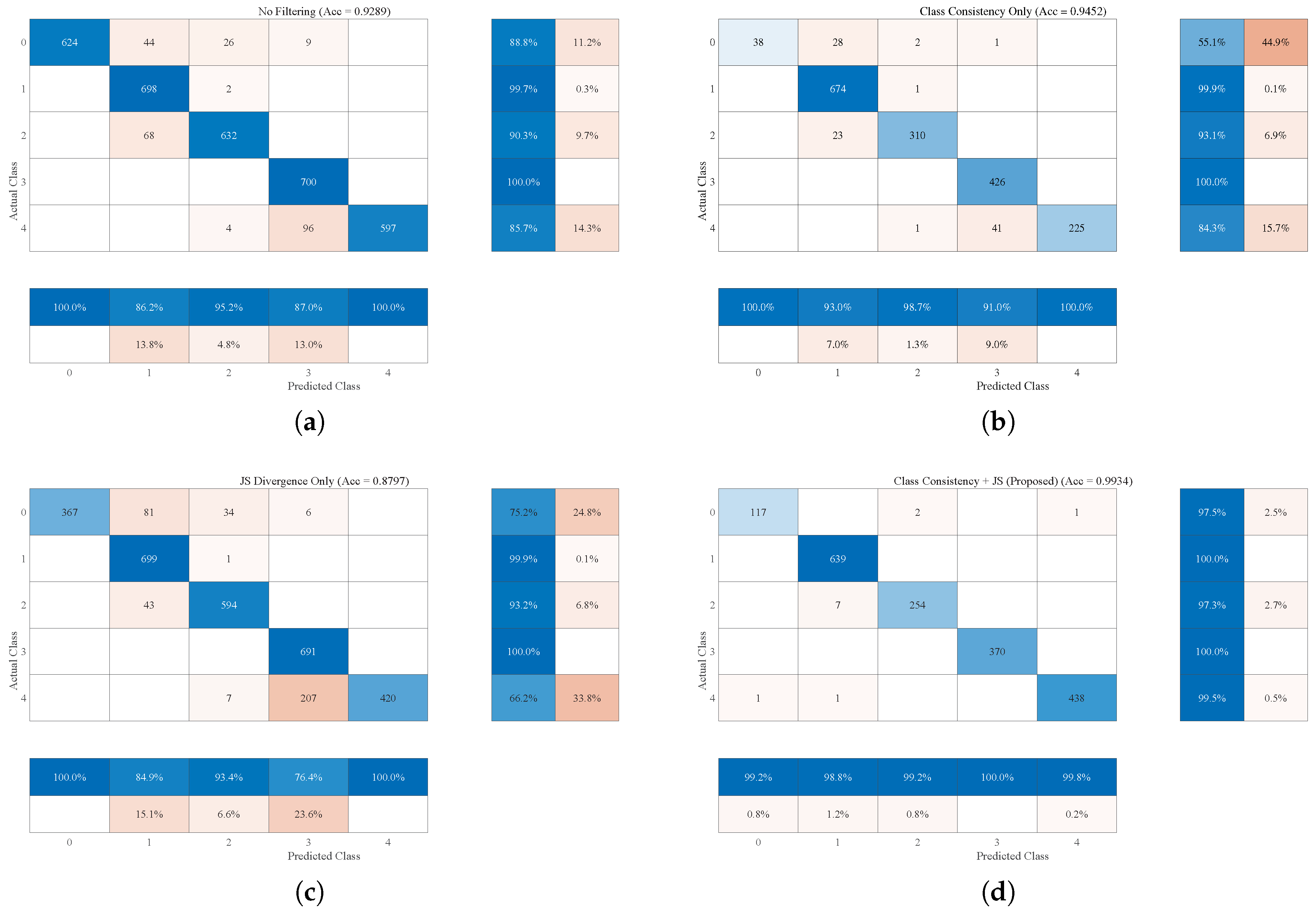 Figure 7b), though a high misclassification rate persists for class 4. The recall for classes 0 and 4 is reduced by JS-divergence alone (