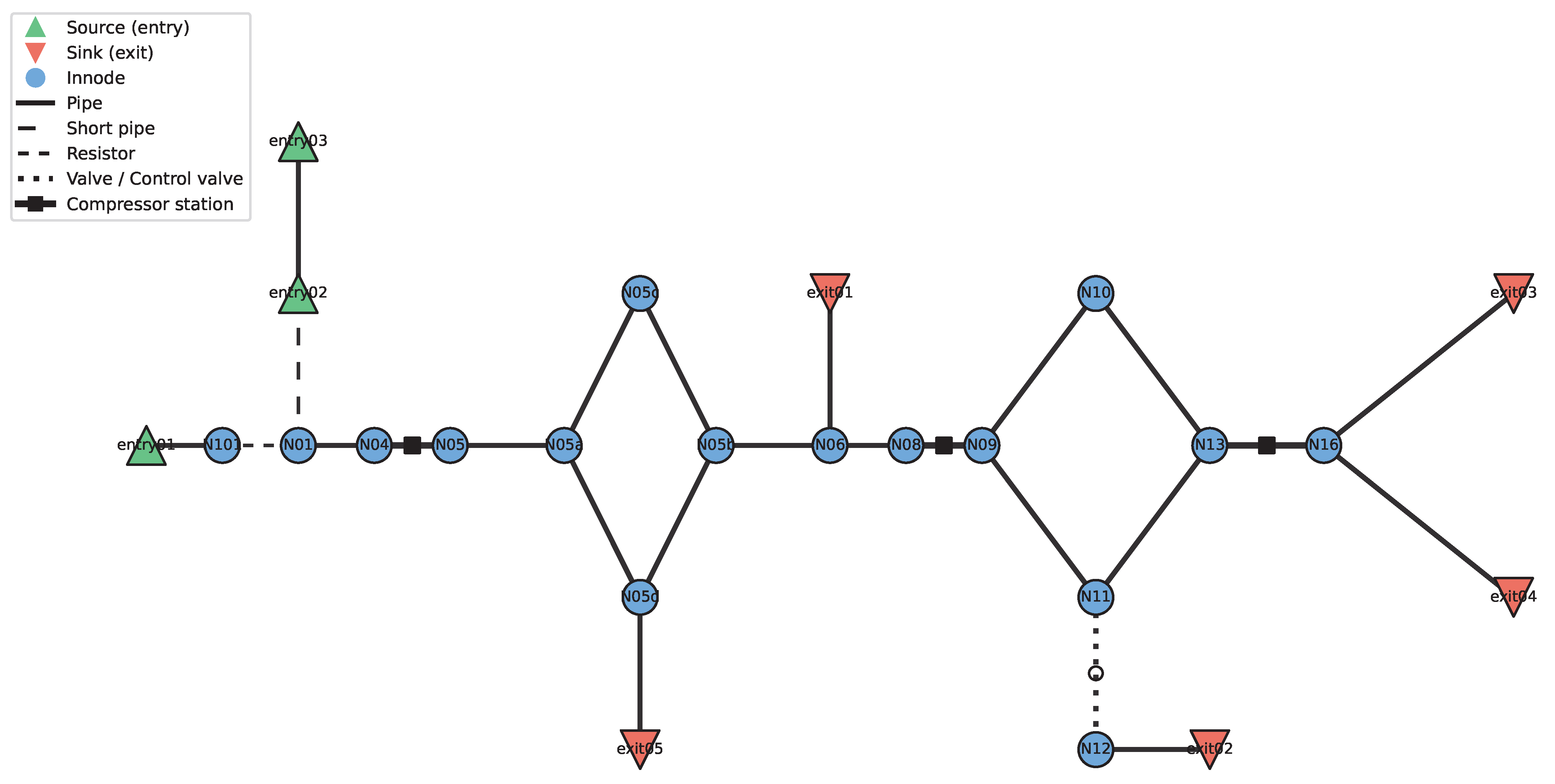- Schmidt, M.; Aßmann, D.; Burlacu, R.; Humpola, J.; Joormann, I.; Kanelakis, N.; Koch, T.; Oucherif, D.; Pfetsch, M.E.; Schewe, L.; et al. GasLib—A Library of Gas Network Instances. Data 2017, 2, 40. [Google Scholar] [CrossRef]