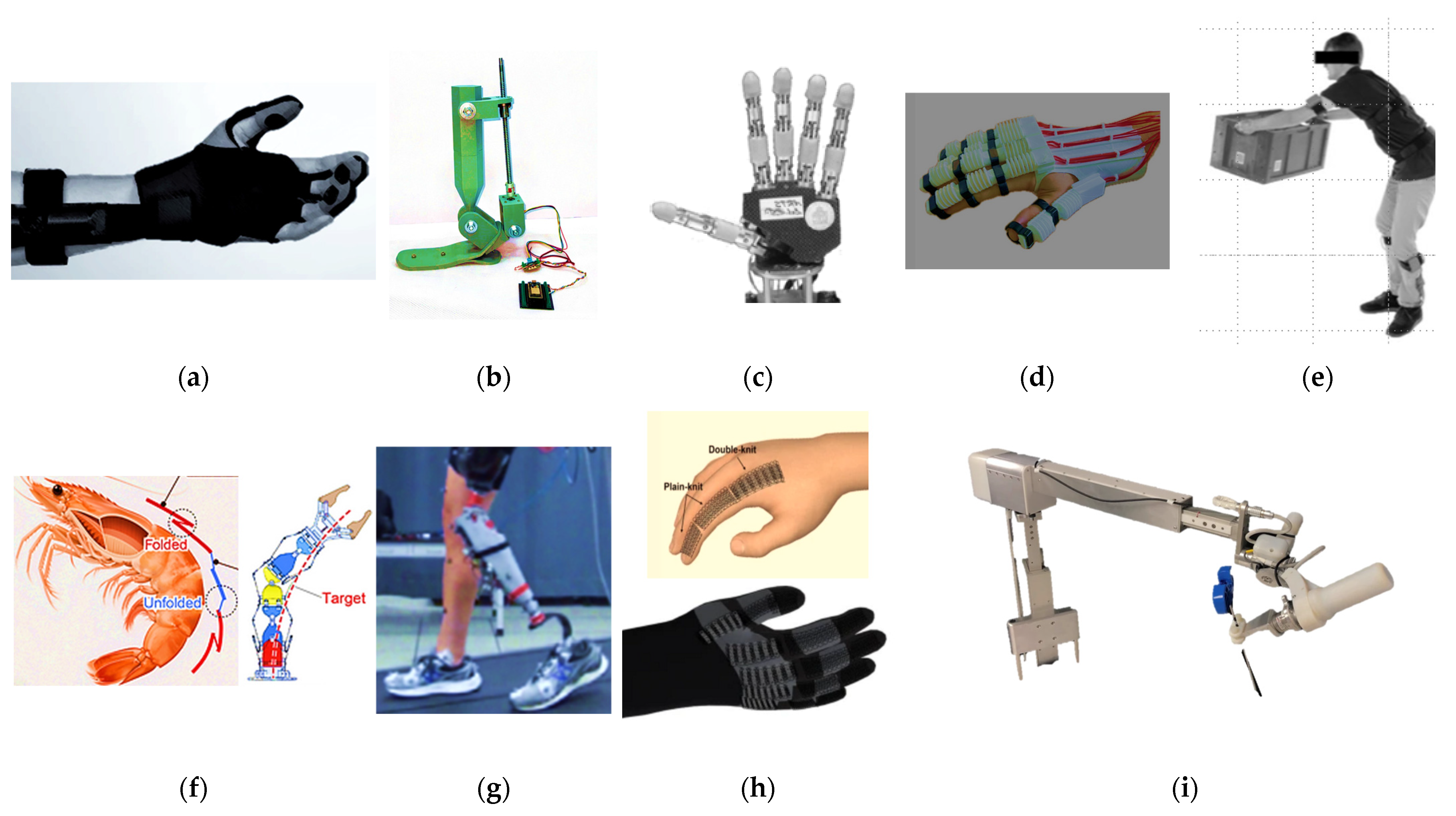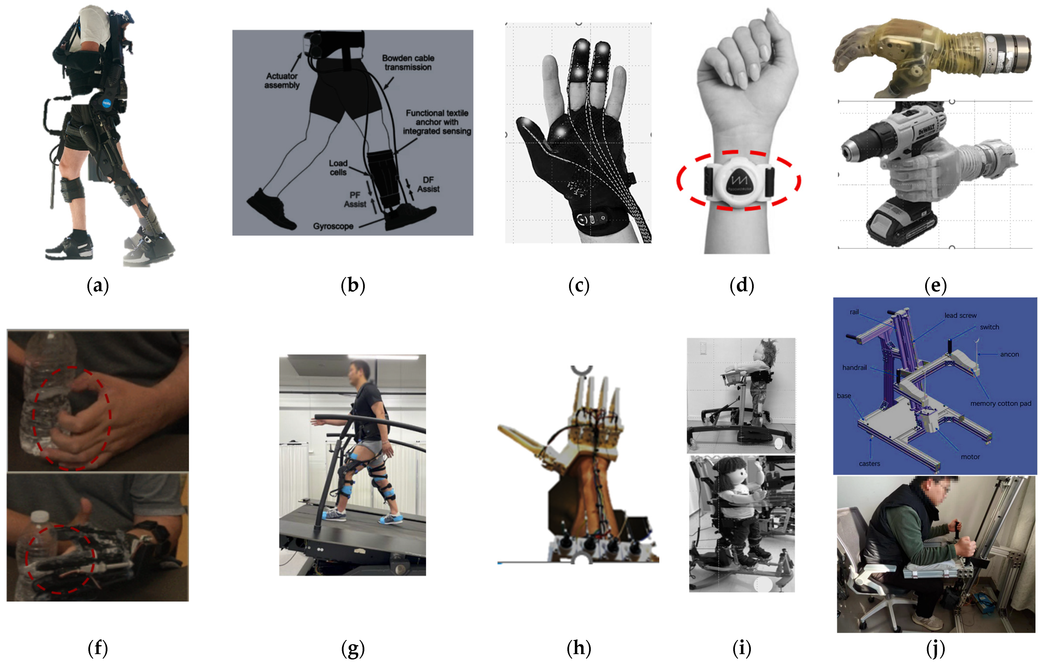 | 2 | Cyberdyne HAL [84] is a type of exoskeletons that predict user intent for applications like going up and down stairs, climbing, and lowering to pick something | Electro-hydrostatic actuator | HAL is a wearable device that reads your brain’s slight movement signals through skin sensors and helps your body move as you intend | Reads bioelectric signals (EMG) from skin |