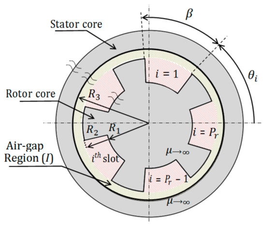 As shown in Figure 1, this machine has been partitioned into two regions: Region ( I ) for the air-gap and Region ( i ) for the rotor slots.