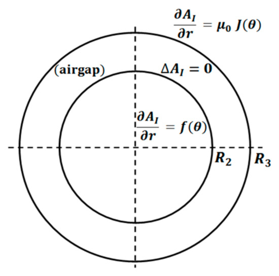 The Laplace’s equation governing the field in the air-gap subdomain, which is an annular domain delimited by the external radius of the rotor R 2 and the stator internal radius R 3 , is given by: