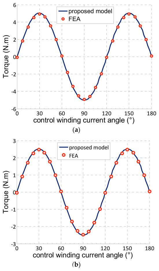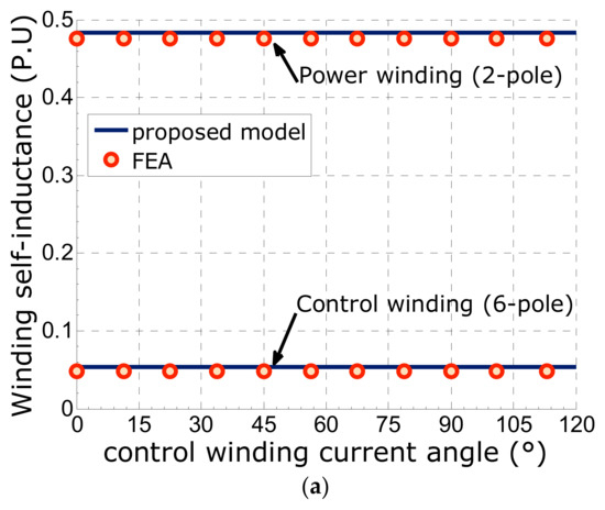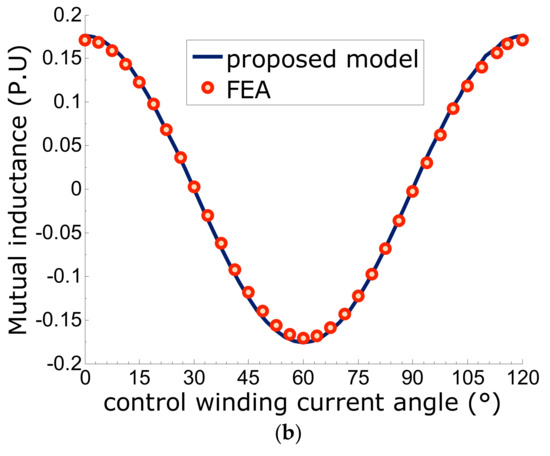 Figure 8 shows the evolution of self and mutual inductances, as a function of control winding current angle, obtained by analytical model and finite element simulations. In Figure 8b, it can be seen that the variation in the mutual inductance expresses the reluctance nature of the BDFRM.