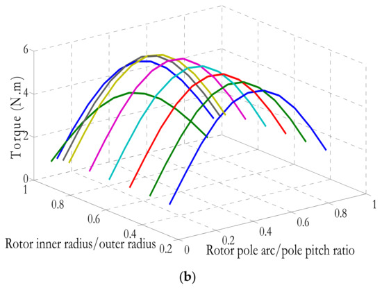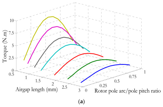 Figure 9. Developed torque as a function of rotor pole arc/pole pitch ratio in different scenarios: (a) Air-gap lengths, (b) Rotor inner radius/outer radius, with air-gap length of 1 mm. Peak value of the current density of the power winding J p m a x = 25,000   A /m; Peak value of current density of control winding: J c m a x = J p m a x , α 1 = 0 ° , α 2 = 30 ° .