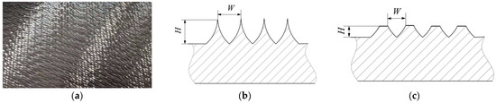 Milling tool marks and their cross-sectional schematic diagrams: (a) milling marks on a water turbine blade; (b) cross-section schematic diagram of a milling mark before grinding; (c) cross-section schematic diagram of a milling mark after grinding.