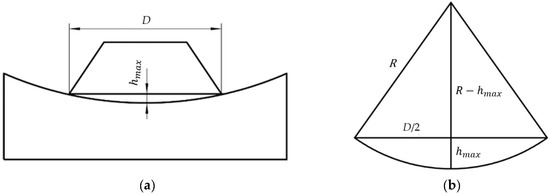 When in vertical contact, the bowl-shaped grinding wheel comes into contact with the curved workpiece as shown in Figure 3a. The vertical height from the lower end face of the bowl-shaped grinding wheel to the bottom of the curved surface, as well as the radius of curvature of the workpiece, is shown in Figure 3b. Assuming the radius of curvature of the workpiece is R, the diameter of the bowl-shaped grinding wheel’s end face is D, and the farthest distance between the bottom of the bowl-shaped grinding wheel and the workpiece’s curved surface is hmax, we can derive the following equation: