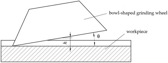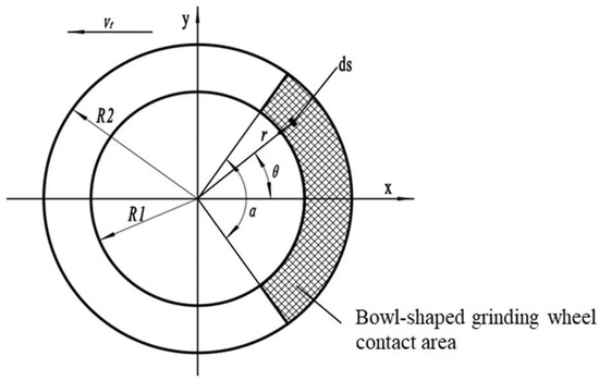 During the grinding process, referring to the simulation results in Figure 7b, the contact area can be approximated as shown in Figure 8. Here, and are the inner and outer radii of the end face of the bowl-shaped grinding wheel, and is the angle of the bowl-shaped grinding wheel’s contact area.
