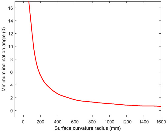 Combining Equations (2) and (3), when the diameter of the grinding wheel D is 75 mm, the relationship between the curvature radius of the workpiece and the minimum inclination angle of the bowl-shaped grinding wheel is calculated, as shown in Figure 5. It can be seen from the figure that as the curvature radius of the workpiece increases, the minimum inclination angle of the bowl-shaped grinding wheel decreases; when the curvature radius of the workpiece exceeds 500 mm, the rate of decrease slows down and tends to 1°.