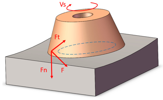 Grinding force is one of the important factors affecting the grinding effect, which is generated by the contact between the grinding wheel abrasive particles and the workpiece during the grinding process. The grinding force is composed of the contact force and additional forces. The grinding force is composed of the contact force and additional forces. The contact force is a general term for all interaction forces directly generated in the contact area between the grinding wheel and the workpiece, and it is usually related to the direct measurement values of sensors in engineering. In engineering, the contact force accounts for more than 90% of the grinding force. The additional forces have an extremely small impact on the magnitude, direction, and variation trend of the grinding force and can thus be ignored. Therefore, in engineering, the grinding force is usually equated to the contact force. Grinding force not only induces surface deformation of the workpiece, but also generates grinding heat and vibration during machining—both of which affect machining quality and accuracy. Grinding force generally acts in three perpendicular directions, namely the normal grinding force along the radial direction of the grinding wheel, the tangential grinding force along the tangential direction, and the axial grinding force along the axial direction. Due to the large negative rake angle of the grinding wheel abrasive grains, ; thus, the axial force is negligible. When grinding surfaces with a large curvature radius, the inclination angle of the bowl-shaped grinding wheel is generally very small, and the horizontal component of the normal force can also be ignored. Therefore, when grinding large curvature radius surfaces, the grinding force of the bowl-shaped grinding wheel can be decomposed into normal grinding force along the normal direction of the contact interface and tangential grinding force perpendicular to this normal direction, as shown in Figure 6.