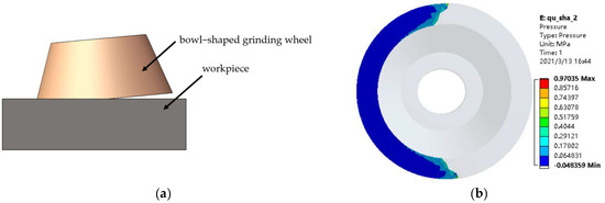 Although the end face of the bowl-shaped grinding wheel is a rigid plane, its contour is a circular ring. By tilting the bowl-shaped grinding wheel to contact the curved workpiece surface, its contour curve can be made to conform to the curved surface, as shown in Figure 7a. The contact method is set to Bonded contact, and the lower end face of the workpiece is subjected to fixed constraints. A load of 15 N is applied to the upper end face of the bowl-shaped grinding wheel. The simulation results are shown in Figure 7b. From the simulation results, it can be seen that when the bowl-shaped grinding wheel is tilted for grinding, the contact between the wheel and the curved surface is distributed on one side, the contact area is continuous, and the pressure distribution is relatively uniform.