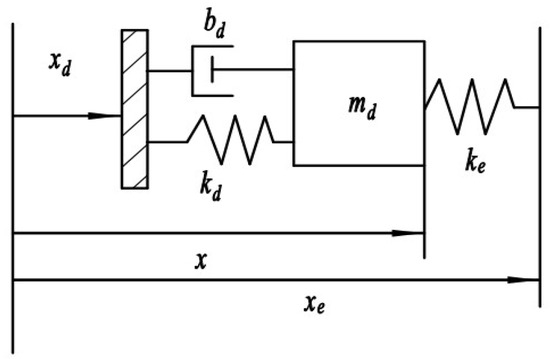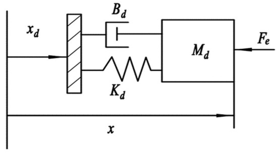 Impedance control integrates force control and position control by analyzing the dynamic relationship between the robot’s end-effector position and contact force, and thereby achieves force–position control using a unified control strategy [14]. The essence of impedance control lies in establishing a dynamic model between the robot’s end-effector position and the contact force; this model refers to the mass–spring–damping model shown in Figure 9.