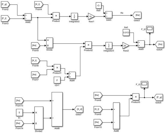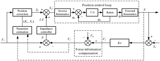 In the actual grinding process, the grinding environment is highly complex, and the environmental stiffness and position may change at any time—this will have a significant impact on the performance of the control system. The position-based impedance control model cannot adjust the target impedance parameters in real time according to changes in environmental stiffness and position during system operation; consequently, it may fail to achieve the desired grinding effect or even complete the grinding task. Real-time online estimation of the environmental stiffness coefficient and environmental position can eliminate environmental parameter errors and enhance the adaptability of the control systems. Specifically, real-time estimation of environmental stiffness and position—implemented via adaptive parameter estimation—is used to modify the reference trajectory. The model diagram is shown in Figure 12.
