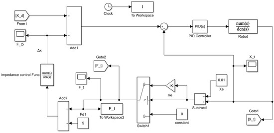 The coefficients , , and in Figure 11 represent the mass coefficient, damping coefficient, and stiffness coefficient of the robot system, represents the environmental stiffness, represents the environmental position, and represents the actual position of the robot. The environmental model can be expressed as