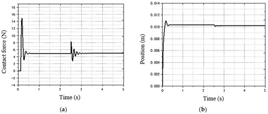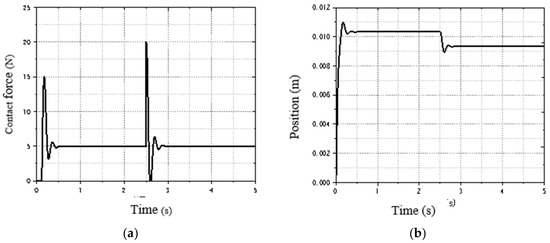 Simulation of abrupt change in environment stiffness at 2.5 s: (a) force response curve of adaptive impedance; (b) position tracking curve of adaptive impedance control.