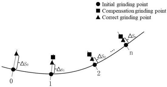 By substituting the normal force deviation into the difference equation, the real-time position correction quantity can be obtained. Let the position points before and after correction be and , respectively, the direction of vector (from to ) is collinear with both the normal direction of the grinding point and the axial direction of the tool coordinate system. Therefore, by offsetting the position from to along the normal direction in the tool coordinate system, the tracking of the desired contact force can be achieved.