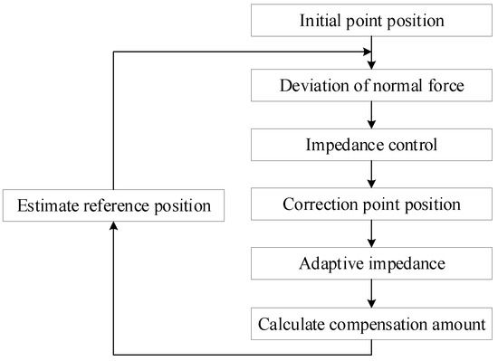 The dynamic trajectory planning method first records the initial grinding points along the workpiece surface to generate the initial grinding trajectory. Then, it corrects the unreasonable position of the initial trajectory using a constant normal force impedance control strategy to complete the entire machining process. The specific steps of initial trajectory planning are as follows: select target points appropriately within the machining area, move the robot to each target point, adjust it to a suitable posture, record the point information as a trajectory teaching point, and repeat the above operations sequentially for the remaining target points to complete the initial trajectory planning. Figure 17 and Figure 18 show the schematic diagram of dynamic trajectory adjustment and the flowchart of adaptive impedance control, respectively. The steps of dynamic trajectory adjustment are as follows: the robot first moves to the first initial grinding point, measures the normal force value at this point, and obtains a corrected grinding point via the impedance control strategy. This corrected point is derived from the initial teaching point and has high accuracy. Next, the robot is controlled to move to this corrected grinding point, where position and force information are collected to estimate the next reference position. Position compensation is then performed on the next initial grinding point to obtain a new reference position. Finally, the robot is controlled to move to this reference position, and the aforementioned correction and compensation process is repeated.