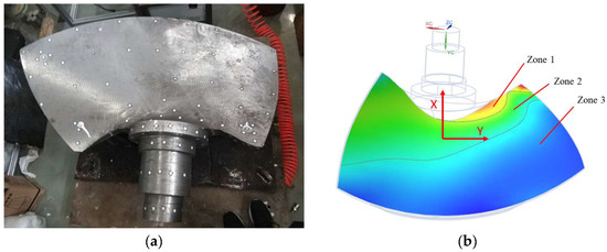 The experimental grinding object is a certain model of water turbine blade actually produced by the enterprise, as shown in Figure 19a. The blade material is stainless steel, with overall external dimensions of 1000 × 680 × 470 mm and a weight of approximately 600 kg. Based on the absolute curvature, the main surface of the blade can be divided into three zones via a cloud map and contour line visualization, as shown in Figure 19b. Among these, Zone 1 has an absolute curvature of 0.001–0.0033 mm−1, Zone 2 has an absolute curvature of 0.00058–0.001 mm−1, and Zone 3 has an absolute curvature ranging from 0.00016 to 0.00058 mm−1. The surface in Zone 1 has the highest curvature, while that in Zone 3 has the lowest. The absolute curvature within the same zone is relatively consistent, and variations in curvature have little impact on the grinding process. The overall scheme of the robotic automated grinding and processing platform system is shown in Figure 20, and Table 2 lists the main performance parameters of the grinding tool.