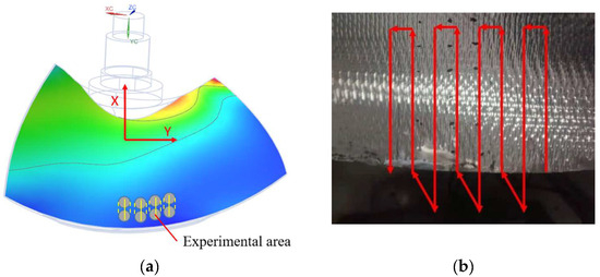 A 200 × 300 mm area on the surface was selected for the automated machining experiments, as shown in Figure 21a. The acquisition of a grinding trajectory is a critical link in robotic automated machining, as it significantly impacts grinding quality and processing efficiency. Common grinding paths include the Hilbert surround path, Zigzag scan path, and Spiral circular path. For this experiment, the grinding area near the blade tip edge was chosen. Due to the gentle curvature variation in this area, a Zigzag trajectory was adopted to guide the robot’s movement, as shown in Figure 21b. Based on the material removal formula (Equation (4)), the trajectory spacing was set to 20 mm, the grinding step size to 25 mm, and the feed step size to 20 mm.