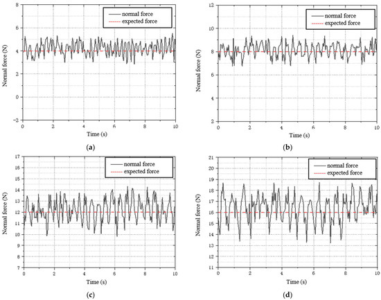 Based on the analysis of grinding force in Chapter 2 and the data from our experimental platform, the grinding force is set as 4 N, 8 N, 12 N, and 16 N, and experiments are conducted separately. The curves of force data during the grinding process for a period of time are drawn, as shown in Figure 22. The grinding force fluctuates around the set value center, basically achieving stable control of the grinding force. As stated in Section 2.3, “This study takes the normal grinding force as the control objective.” Therefore, in our experimental analysis, the object of analysis is the normal grinding force proposed in Section 2.3, and the analysis results are shown in Figure 22. As shown in Figure 22a, with a given grinding force of 4 N, the maximum absolute value of the force fluctuation is 1.5 N, and the fluctuation percentage is 37.5%. As shown in Figure 22b, with a given grinding force of 8 N, the maximum absolute value of the force fluctuation is 1.5 N, and the fluctuation percentage is 18.8%. As shown in Figure 22c, with a given grinding force of 12 N, the maximum absolute value of the force fluctuation is 2.2 N, and the fluctuation percentage is 18.3%. As shown in Figure 22d, with a given grinding force of 16 N, the maximum absolute value of the force fluctuation is 2.7 N, and the fluctuation percentage is 16.9%. The fluctuation percentage is the smallest when the given grinding force is 16 N, which corresponds to the best grinding effect.