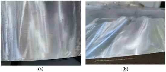 The robot grinds according to the taught points. After 20 repeated machining cycles with the optimal grinding force of 16 N, the obvious knife marks on the blade surface disappear. Nine points were selected on the ground surface to measure roughness using a surface roughness tester, and the average value of the measurement results was calculated. The average surface roughness value was found to be , which is lower than the enterprise’s roughness of , indicating that the grinding quality meets the expected requirements. Since the experimental grinding area is 200 × 300 mm, the average total grinding time to meet the surface roughness requirement is approximately 11.2 min. Through calculation, the grinding efficiency is about 0.89 , which is higher than the enterprise’s efficiency of 0.47 . The surface of the ground blade is shown in Figure 23.