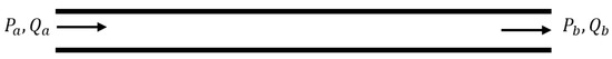 where and are determined by the boundary conditions at the ends of the line, defined by the flow rates and pressures. Using Equation (A25), we obtain