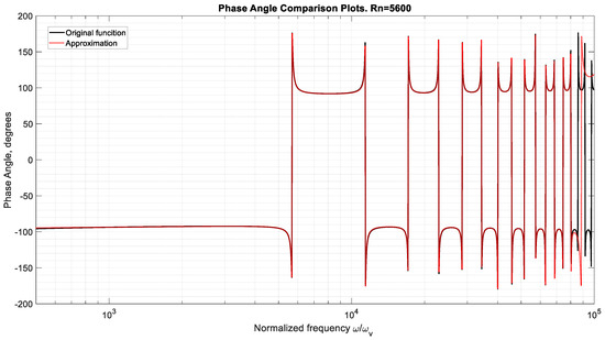 Normalized frequency response phase angle of the transfer function in Equation (26) compared to a ninth order rational polynomial approximation obtained used an inverse frequency algorithm out to a normalized frequency of 700.