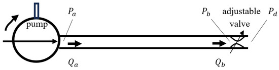 The pre-transient turbulent flow model is based on using the analytical model in Equation (A45) in series with a lumped resistance sized so that the resulting model for the line has the same steady-flow resistance as a smooth line with pre-transient turbulent flow [12]. To potentially improve the accuracy of the model for relatively large Reynolds numbers, the resistance is distributed along the line by dividing the line into n-sections. The schematic for such a multi-sectioned model is shown in Figure A1, where , , , and are intermediate pressures and flows.