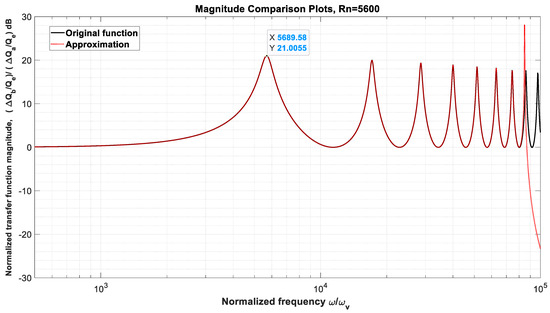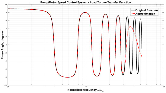 The frequency response for the load variation transfer function in Equation (26) and a 15th order transfer function approximation are shown in Figure 8 and Figure 9 for a matching normalized frequency range of 1 to 2600. Note the near perfect accuracy of the approximation, both magnitude and phase, over the specified frequency range and out to approximately 3000.