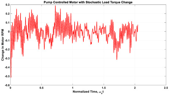 There are two transfer functions in Equation (26) for the inputs and . Thus, the time history of the rotational speed of the motor, considering the fluid transients, can be obtained for any input specifications, deterministic or stochastic, once the transfer functions have been approximated by ratios of finite order polynomials, as demonstrated in the following example.