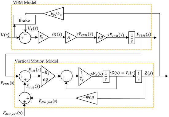 The prototype model used in this work integrates the VBM model with the vertical motion model, as developed in [31]. Given that actuator dynamics are significantly faster than the rest of the system, a reduced-order model, represented in the Laplace domain, is shown in Figure 1.