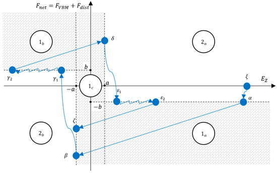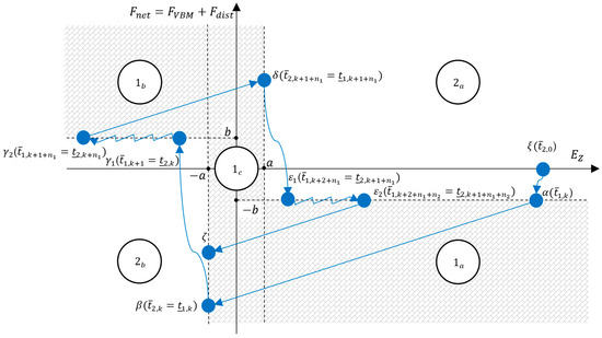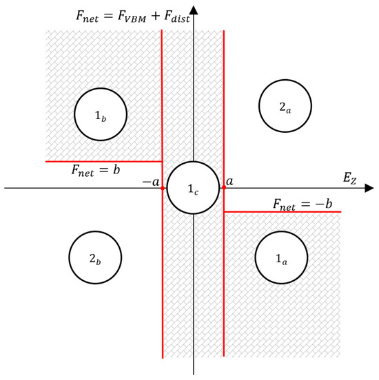In the shaded areas of the schematic in Figure 4, the VBM is switched OFF (corresponding to in Equation (3)), while in the unshaded regions, it is switched ON (). Specifically, the VBM is OFF in regions 1a, 1b, and 1c, and ON in regions 2a and 2b. To account for disturbances, the net force () is represented on the vertical axis of the schematic.