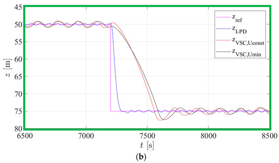 In this context, the authors of this paper recently proposed a variable structure depth controller with a constant-amplitude control action. This controller was designed to reduce energy consumption in an underwater sensor platform with a variable buoyancy module (VBM) [23]. The controller activates only when system dynamics drive the vehicle away from the desired depth and deactivates when they naturally guide it back, minimizing unnecessary actuation. Results in [8] show that this approach reduces energy use by an average of 22% compared to the most efficient PID-based alternative, albeit with a trade-off in control performance. The formal proof of stability of the controller was presented in [24] by demonstrating that if the control action remains within specified upper and lower bounds, the system state remains bounded regardless of its initial rest conditions. The study in [24] also highlights how stability regions vary with parameter choices and mission requirements, offering practical guidance for controller tuning. The proposed control law in [24] was shown to ensure formal stability, even under conservative assumptions. Stability analysis is critical for ensuring safe and reliable operation of underwater vehicles in complex marine environments. Without it, control laws may lead to unpredictable behavior, such as instability, oscillations, or mission failure. Stability proofs such as those based on Lyapunov-based methods [25,26,27] provide assurance of safe autonomous operation, enhancing mission success and reducing risks.