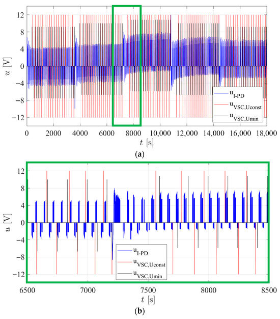 The controller parameters and in Table 1 are strictly positive constants that are used by both the controller developed in [24] and by the one presented in this paper. The two controllers differ on the control action used. The controller presented in [23,24] uses a constant-amplitude control action, , and therefore can be referred to as a variable structure controller with a constant-amplitude control action (). The controller presented in this work is similar but uses a variable-amplitude control action (), designed to be as low as possible while keeping the system stable. As will be shown, this control strategy further reduces energy consumption. This controller will be referred to as , and the formal proof of its stability will be presented in the following sections.